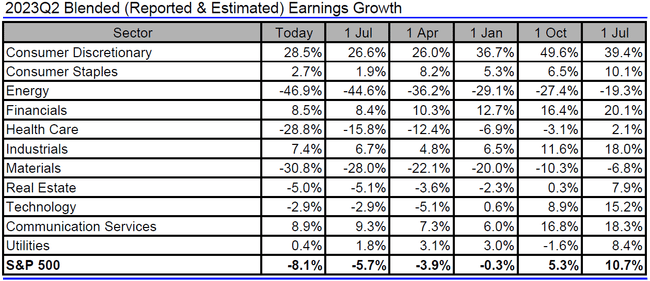 Analiștii intervievați de Refinitiv se așteaptă în prezent ca societățile din S&P 500 să raporteze un declin de 8,1% al profiturilor pentru al doilea trimestru, la o scădere de 0,9% a veniturilor. Se așteaptă ca profituri mai mari de la an la an să fie raportate de firmele din sectorul bunurilor de consum ciclice, în timp ce o scădere a profiturilor este așteptată să fie raportată în principal de firmele din domeniul energiei și al materialelor de bază.