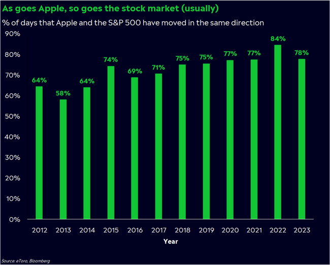 În mod evident, prețul acțiunilor Apple, datorită ponderii mari a titlului în S&P 500, influențează puternic performanța indicelui de referință însuși. Și, prin urmare, nu este atât de surprinzător faptul că, într-o majoritate semnificativă a zilelor de tranzacționare, indicele crește atunci când acțiunile Apple câștigă și scade atunci când titlurile producătorului iPhone pierd.