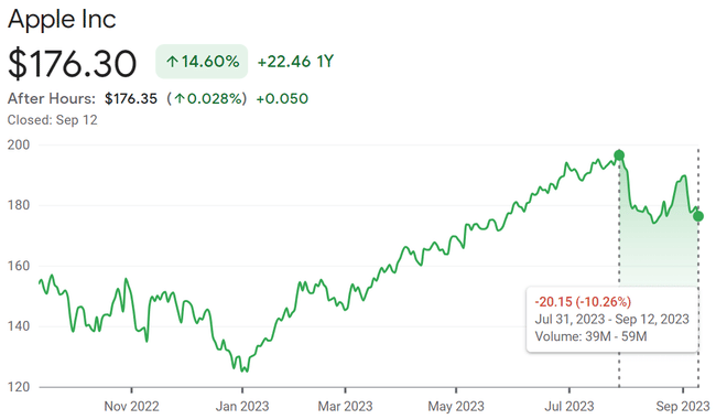 Acțiunile Apple au pierdut 1,71% marți, în ziua în care a prezentat noi dispozitive, în frunte cu iPhone 15. Acestea încă mai scriu peste 10% față de maximul istoric din 1 august, fiind astfel într-o corecție. Investitorii care au plasat bani pe toată linia în S&P 500 și-ar dori cu siguranță să vadă o performanță bursieră mai bună din partea celei mai mari companii cotate la bursă.