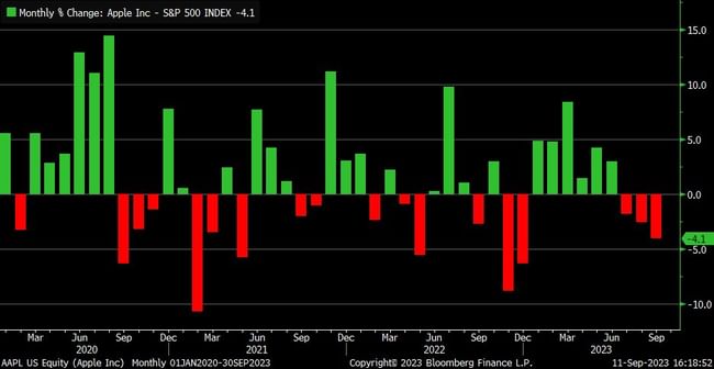 Între timp, luna septembrie a acestui an este cea de-a treia lună consecutivă până acum în care Apple a înregistrat o performanță inferioară indicelui. Acest lucru nu este tocmai un eveniment obișnuit; ultima dată când s-a întâmplat a fost la sfârșitul anului 2020. Merită să remarcăm, așadar, că revenirea semnificativă din acest an a indicelui S&P 500 a avut loc cu acțiunile Apple (și o serie de alte titluri mari din domeniul tehnologiei) care au avut performanțe superioare în cea mai mare parte a timpului. Astfel, actuala sa subperformanță nu este tocmai un semn pozitiv pentru piața în general.
