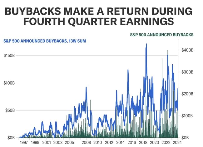 Companii precum Meta, Disney, Uber și altele, urmând ca și altele să apară în acest an, au anunțat planuri de răscumpărare de acțiuni în timpul ultimului sezon de câștiguri. Potrivit datelor de la Deutsche Bank, aceste companii acționează în baza autorizațiilor de răscumpărare, membrii S&P 500 răscumpărând acțiuni proprii în valoare record de 63 de miliarde de dolari în prima săptămână din februarie, cel mai mare total într-o singură săptămână din mai 2023.