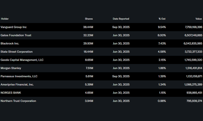 Cel mai mare acționar este Vanguard Group, cu o participație de aproximativ 9,5 %. Gates Foundation Trust deține, de asemenea, o poziție puternică, cu aproximativ opt procente, ceea ce reprezintă un semnal interesant în ceea ce privește sustenabilitatea percepută și natura pe termen lung a activității. Printre alți deținători importanți se numără BlackRock, cu aproximativ 7,5 %, și State Street, cu puțin sub 5 %. În total, WM este deținută de peste două mii și jumătate de investitori instituționali.