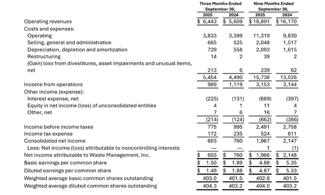 În al treilea trimestru al anului 2025 $WMa atins venituri de 6,44 miliarde de dolari, o creștere de la an la an de aproximativ cincisprezece procente. Majoritatea este încă formată din așa-numita afacere moștenită - adică colectarea tradițională, depozitarea deșeurilor și reciclarea - care a crescut la 5,8 miliarde de dolari. Restul a fost reprezentat de noua divizie de deșeuri medicale a WM Healthcare Solutions, care a adăugat încă aproximativ 0,6 miliarde.