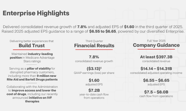 Cu toate acestea, din punct de vedere operațional, trimestrul al treilea poate fi privit ca un progres. Îmbunătățirea rezultatelor medicale, creșterea prețurilor în Caremark și performanța bună a canalului de vânzare cu amănuntul indică faptul că restul activității funcționează bine. Fluxul de numerar a confirmat, de asemenea, că, în ciuda pierderii contabile, compania se îndreaptă spre un echilibru financiar mai bun.