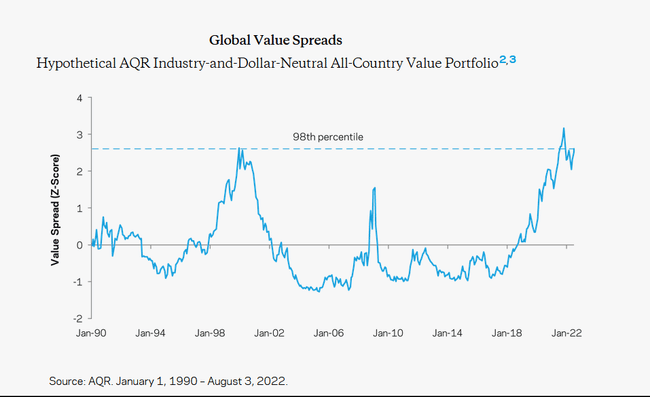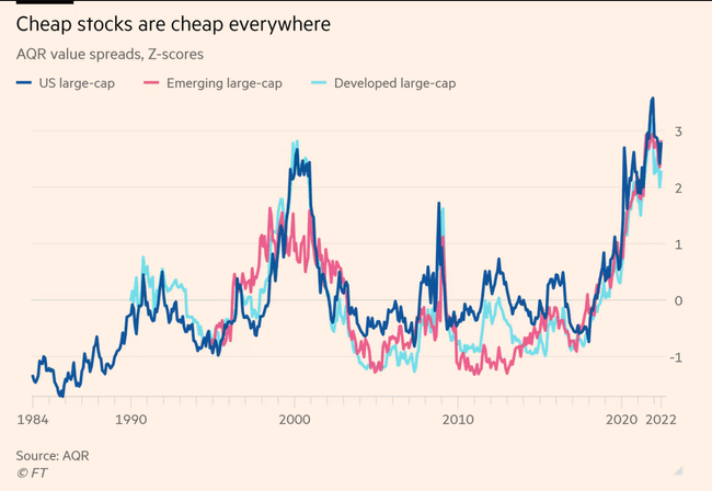 Acum să prezentăm câteva grafice. De la AQR capital, o măsură normalizată a diferenței de valoare din ultimele decenii. Aici mai mare este o valoare mai ieftină. Ei folosesc un calcul complex pentru a calcula evaluarea, pe care îl descriu pe site-ul lor.