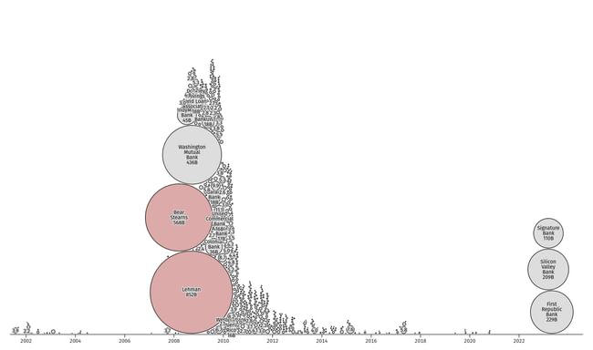Am găsit astăzi o imagine frumoasă care arată falimentele bancare din acest deceniu. Cele de culoare roșie nu erau bănci din punct de vedere tehnic, dar sunt importante pentru context.